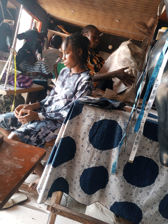 The scene depicts an interior view of a garment workshop in Rido, Nigeria