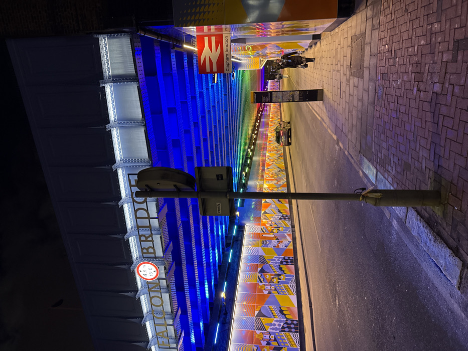 A street view at night with a brightly lit railway bridge overhead. The bridge is illuminated with vibrant blue and rainbow-colored lights, creating a tunnel-like effect. On the right, there's a sidewalk made of paving stones, and the road is empty except for a distant car. A pole with a sign is visible in the foreground, and a red sign indicating "Clapham Junction" is visible above. The walls are decorated with colorful geometric patterns.