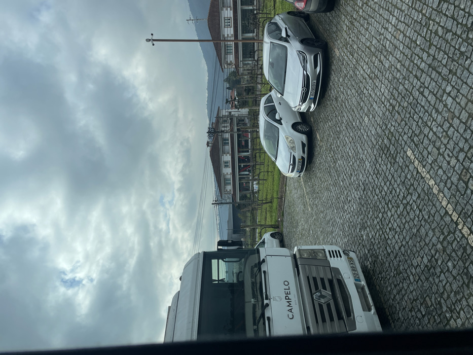 The image displays an outdoor scene on an overcast day in Barcelos, Portugal. The foreground features a parking area paved with dark grey cobblestones, marked by a white dashed line. On the left, the front section of a white Renault truck is visible, bearing the branding "CAMPELO ESTO 1931" and a Portuguese license plate "20-89-XS". Parked on the cobblestones are a white two-door Opel Corsa with license plate "86-PU-35" and a silver five-door Opel Astra with license plate "AO-90-BV". A small white van is partially visible behind the truck, and the front of a dark vehicle is on the far right. Beyond the parking area lies a patch of green grass with rows of dormant grapevines. In the mid-background, two identical two-story white buildings with reddish-brown tiled roofs are present, one featuring red commercial signage on its ground floor. A tall brown utility pole with a light fixture stands on the right side of the frame, accompanied by overhead power lines. Distant mountains are visible beneath a densely clouded sky. No individuals are present in the scene.