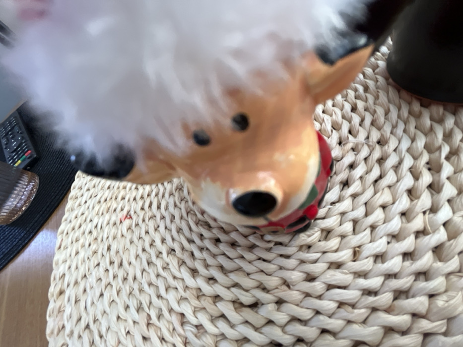 The image depicts a stationary ceramic figurine, possibly resembling a reindeer or a similar animal, positioned on a light tan, braided woven mat