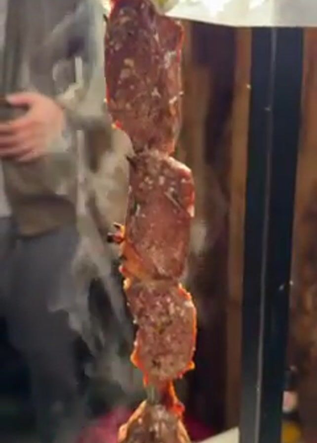 vertical skewer with cooked pieces of meat on it. The skewer is attached to a black stand on a table. Steam rises from the meat. A person in a gray jacket is partially visible in the background, moving their arms. A white plate sits on the table near the base of the skewer stand. The background includes a wall with wood paneling.