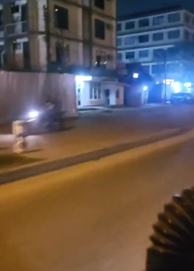 A video shows a night time view from a moving vehicle in an urban area. A building is under construction with scaffolding visible. Street lights illuminate the road and buildings, and traffic is present. The camera moves along the road.
