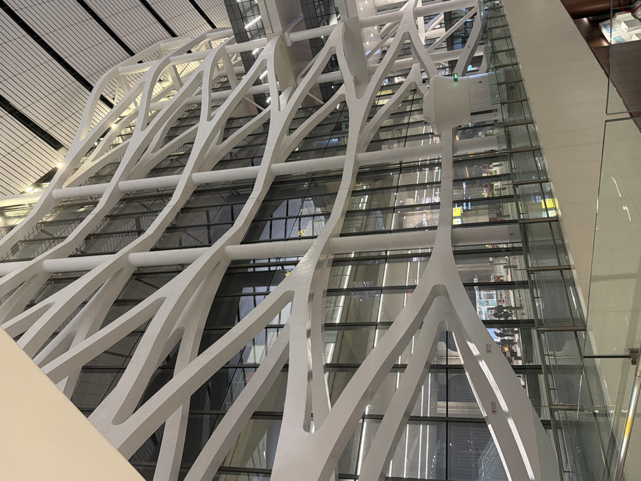 The image displays the interior of the Langfang High-speed Railway Station (Langfang North Railway Station) in Langfang, China. The prominent feature is a multi-story glass curtain wall, partially obscured by an elaborate, white, three-dimensional lattice-like structure. This architectural element consists of thick, curvilinear beams that crisscross in an organic, branching pattern, supported by interspersed cylindrical white columns. The upper portion of the image reveals a high, ribbed ceiling with integrated linear lighting. Below, the building's interior features a multi-level design, with clear glass balustrades defining walkways or overlooks. Through the lower glass panes, several indistinct human figures are visible on a lower concourse or platform. A white, conical fixture with a green light is mounted on a structural beam in the lower right quadrant. Reflections of interior light sources are evident on the glass surfaces. The environment is well-lit and modern.