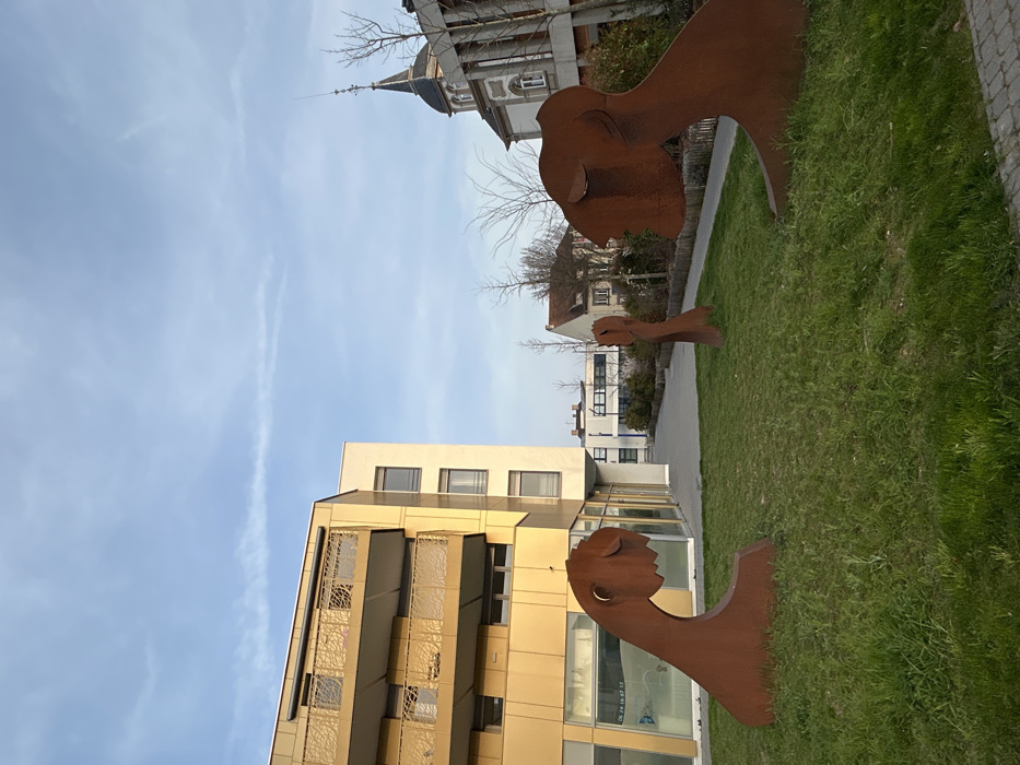 The image depicts an outdoor urban scene in Bischheim, France, under a clear blue sky with minimal cirrus clouds. The foreground features three stylized, weathered reddish-brown metal sculptures resembling human heads and upper torsos, positioned on a patch of green grass. The largest sculpture on the left faces downward with closed eyes. A second large sculpture on the right, in profile, faces left. A smaller, similar sculpture is visible further back, between the two dominant figures. In the mid-ground, to the left, stands a multi-story, modern building with a light-colored facade, featuring three balconies with ornate gold-colored, organically patterned railings. The ground floor has large windows, one displaying the numerical sequence "06 24 16 07 12." A paved walkway runs between the grass area and this building. To the right, in the background, an older building is visible, characterized by a dark, pointed turret topped with an ornate spire. Bare tree branches are visible around and in front of this older structure. No individuals are present in the scene.