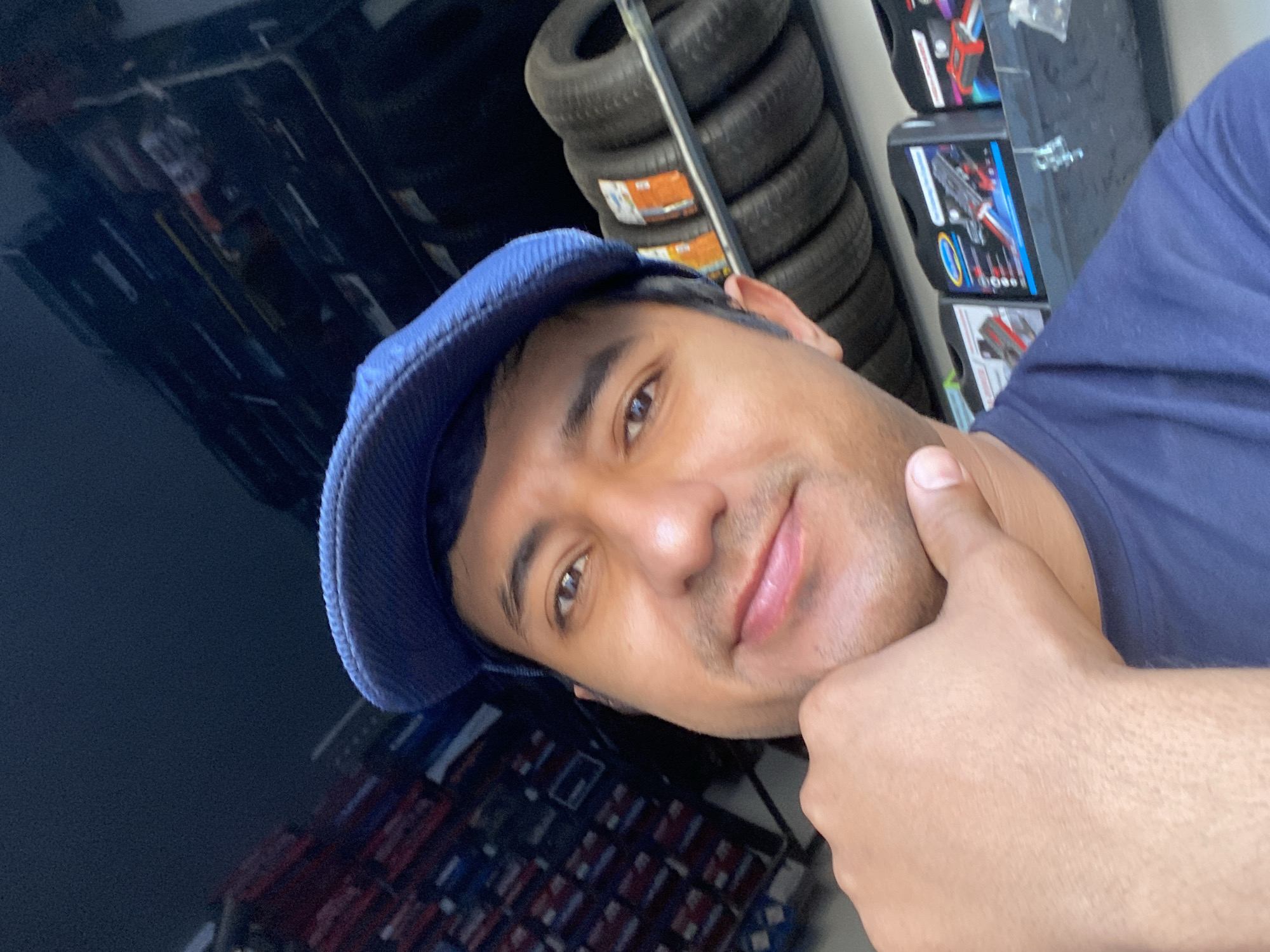 selfie of a man wearing a blue newsboy cap and a dark blue t-shirt. He is holding his hand up to his chin, appearing to be posing. Behind him are stacked tires and boxes of what appear to be car parts. The setting appears to be a tire or auto parts shop. Without additional information, it is impossible to confirm the location in Bukhara, Uzbekistan.