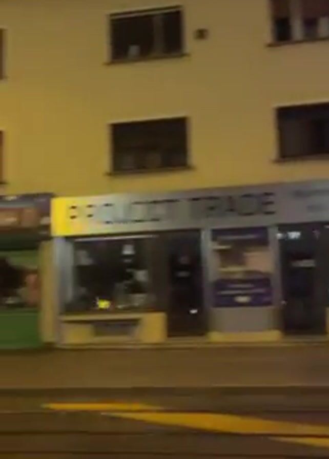 street at night. The camera is moving along the street, showing buildings with storefronts. The buildings are of various colors, including cream, green, and gray. The storefronts are decorated with lights and signs. There are sidewalks and road markings visible. People can be seen walking on the sidewalk. A few parked cars are also visible. The overall environment appears to be an urban setting at night.