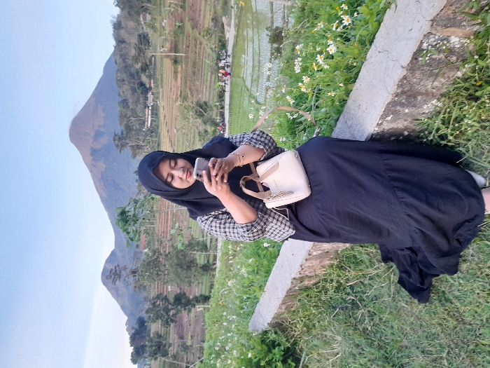 An adult female is depicted seated on a low, weathered concrete barrier in an outdoor rural setting in Penanggungan, Indonesia. She wears a black hijab, a black and white plaid long-sleeved shirt, and a long, dark blue tiered skirt, with light-colored closed-toe shoes. A small, light beige handbag with a brown strap and metal charm rests on her lap. She is holding a dark-colored smartphone with both hands, looking down at the screen, and appears to be interacting with the device. The immediate foreground features green grass interspersed with small white and yellow wildflowers. Behind the woman, the landscape consists of extensive green rice terraces on gentle slopes, dotted with trees and other vegetation. In the far background, two prominent mountains rise under a clear blue sky, with the larger, central peak being Mount Penanggungan. Several indistinct figures are visible in the distant background, near the rice paddies. The lighting suggests daytime conditions.