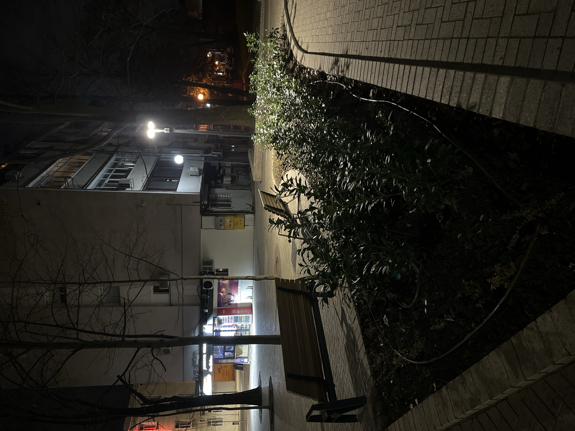 The image depicts a nighttime urban pedestrian area in Dobrich, Bulgaria. In the immediate foreground, a light-colored brick-patterned sidewalk borders a curvilinear planter bed. This bed contains numerous dark green, low-growing bushes, with thin black irrigation tubing visible across the exposed soil. Two empty wooden slatted benches with dark metal frames are positioned on the sidewalk to the left, facing away from the camera. The midground features a paved square and several bare-branched deciduous trees. To the left, a brightly illuminated kiosk or small shop is visible, showcasing a display of bottled beverages, including a red Coca-Cola cooler, and signage with Cyrillic text, partially reading "ЖАРЕНА ЦАРЕВИЦА" (Roasted Corn) on its awning. Behind this commercial structure and extending to the right is a multi-story building, likely residential or mixed-use, with multiple windows and visible exterior air conditioning units. A prominent modern streetlight with two luminaires illuminates the central midground. The background is dark, with additional trees and multiple ambient light sources from other streetlights and distant structures, casting long shadows across the paved areas. No individuals are present within the frame.