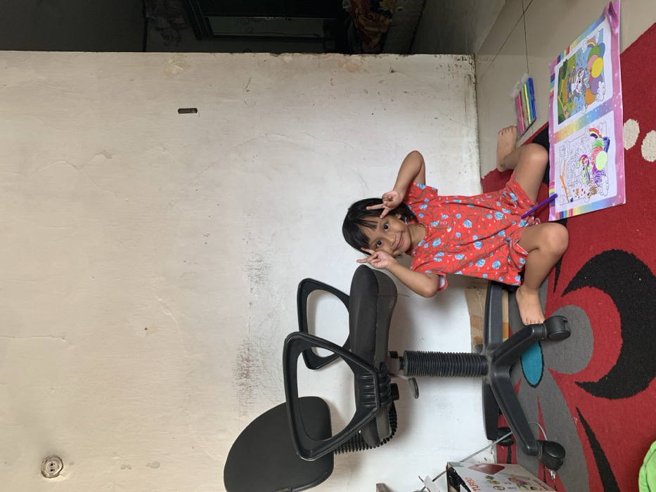 An indoor scene in Kecamatan Pati, Indonesia, depicts a young Asian girl seated barefoot on a red and black patterned rug