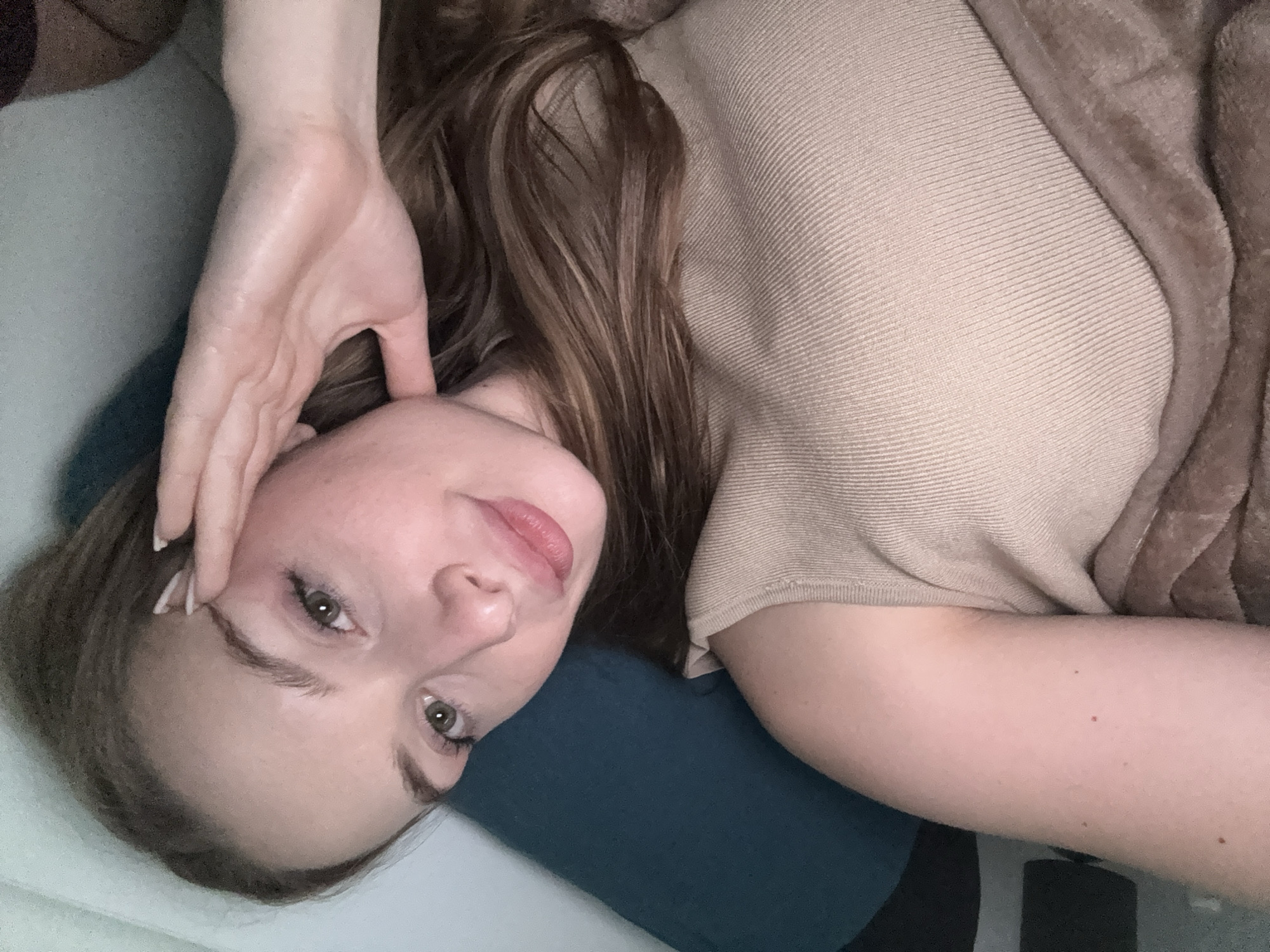 An adult female is depicted reclining in an indoor setting, identified as being in Budva, Montenegro. She lies on her left side, facing the camera with a slight smile and direct gaze. Her head rests on a dark teal cushion or pillow. She has long, wavy brown hair with lighter highlights, cascading over her left shoulder and chest. She wears a light beige, short-sleeved, ribbed knit top. Her left arm is bent, with her left hand supporting her jawline and temple; her fingers display white manicured nails. A light brown, plush, textured blanket or comforter partially covers her body from her left shoulder downwards. Her skin tone is fair, with a few small moles visible on her exposed upper left arm. The background behind her is indistinct and dark.
