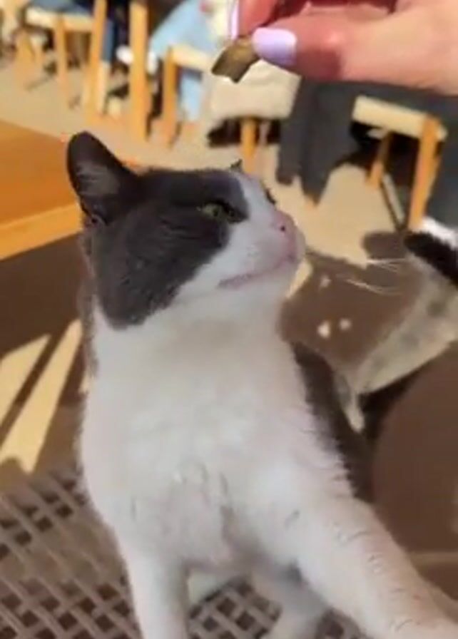 A gray and white cat sitting on a white wicker chair outdoors is being fed a small, dark morsel from a person’s hand. The person has purple fingernails. The cat is facing the hand, looking upwards, and opens its mouth to receive the food. People and outdoor café furniture are visible in the background. The cat has white whiskers. The light appears bright and sunny.