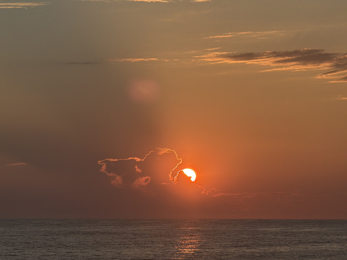 The sun partially obscured by clouds dominates the frame during sunset. The bright orange sun peeks from behind the cloud formation. The sky displays an orange hue fading to lighter tones. Below, the ocean reflects the sunlight, creating a glimmering trail on the water's surface. Some light cloud cover near the top of the frame. The overall scene evokes a sense of tranquility and beauty.