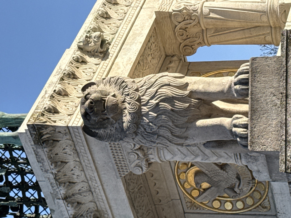 - "The image displays a weathered, light-colored stone lion statue, situated at the Fisherman's Bastion (Halászbástya) in Budapest, Hungary" by FM-nJ3pG2, licensed under CC BY 4.0