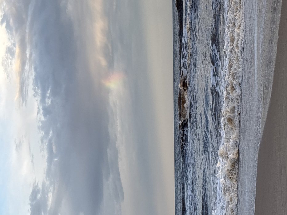 beach scene divided roughly in half. The left side displays a cloudy sky with a faint rainbow-like band of color. The right side shows the ocean with waves crashing onto the sand. The water is a muted blue-gray, and the sand is a light beige. The picture is oriented vertically.