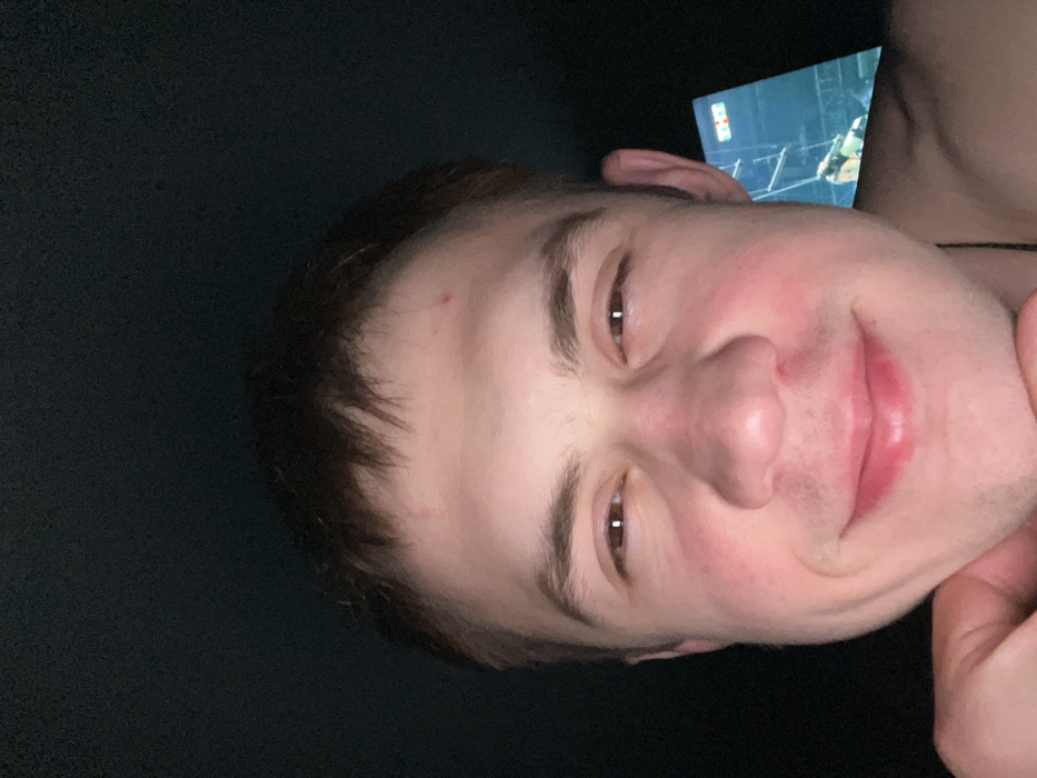 A young adult male is depicted in a close-up, front-facing self-portrait
