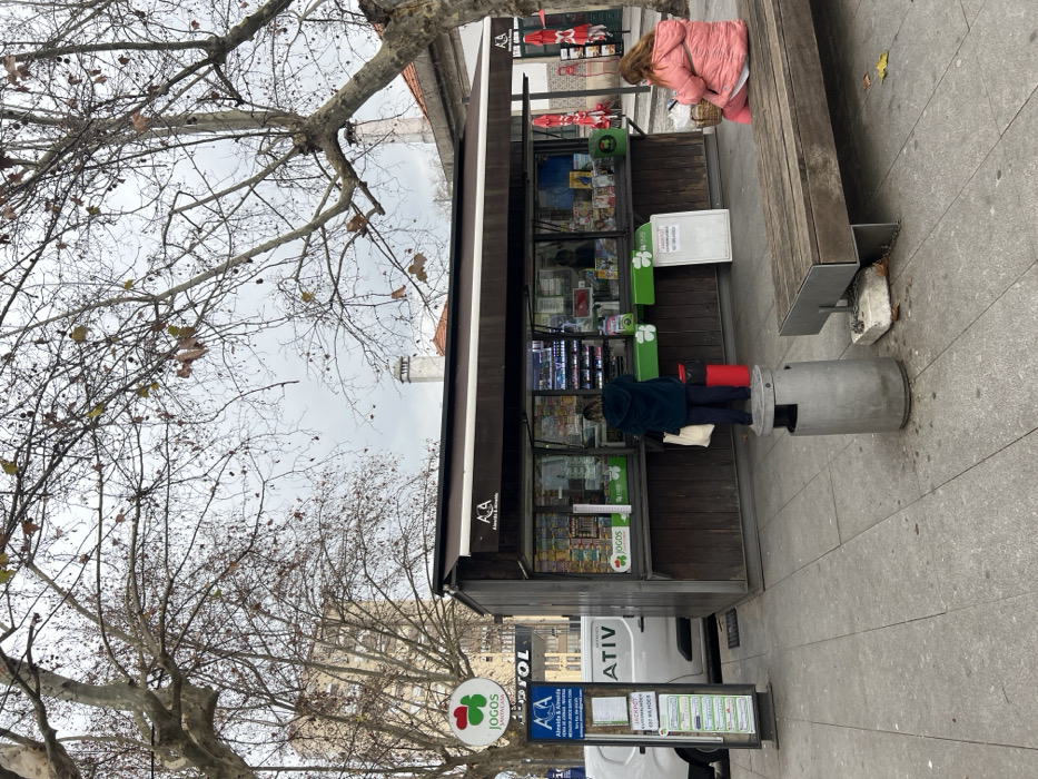 The image depicts an outdoor urban scene in Peso da Régua, Portugal, under an overcast sky, with bare-branched trees suggesting a colder season. The central focus is a dark-brown wooden kiosk with a dark awning, branded "Almeida & Almeida" and featuring "JOGOS SANTA CASA" signage. The kiosk displays various retail items through its windows, including snacks, drinks, and magazines. Two individuals are present: 1. A person in a dark blue/green hooded jacket and dark trousers stands facing the kiosk, holding a light-colored tote bag, seemingly engaged in a transaction. This person is positioned to the right of a cylindrical metal trash bin. 2. A second person with reddish-brown hair, wearing a pink puffer jacket and pink trousers, sits on a modern wooden bench to the right of the kiosk, holding and looking at a mobile phone. A woven basket rests next to this individual on the bench. To the left of the kiosk, a tall grey metal information stand displays various posters, including "JOGOS SANTA CASA" branding and "JACKPOT" details. A white commercial van with "ATIV" on its side is partially visible behind this stand. In the background, a multi-story building and other structures with white chimneys are visible. Red patio umbrellas are faintly seen further down the street to the right. The ground is paved with light grey flagstones.