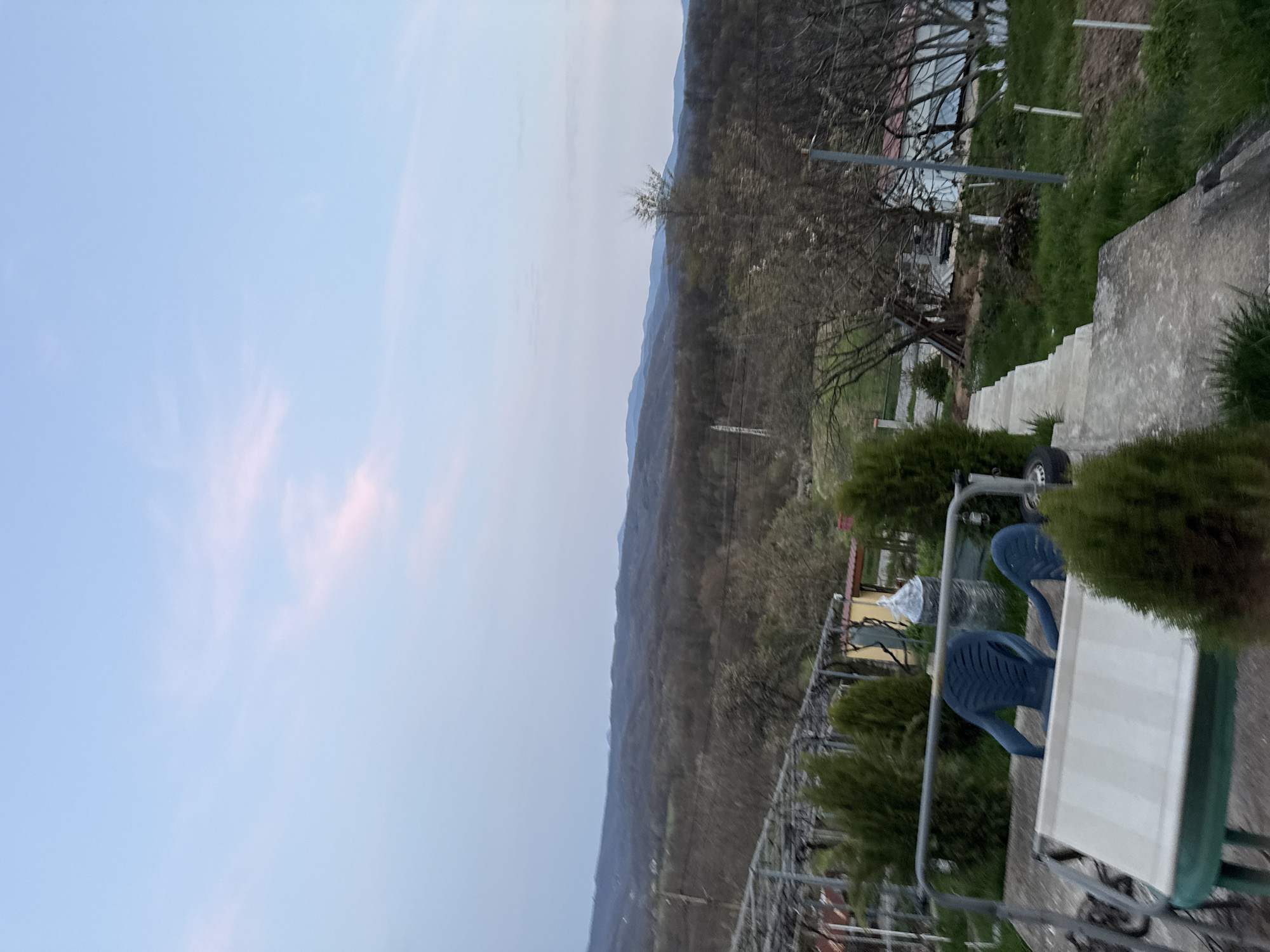 n outdoor scene in Balinovtsi, Bulgaria. The view overlooks a forested mountain range under a pale sky with hints of pink. In the foreground, there's a patio area with a white garden swing featuring two blue plastic chairs. There are some green bushes near the patio and a set of concrete stairs leading upwards. A house and a small section of a road are visible among the trees in the mid-ground. The image suggests a residential area with a view of the surrounding natural landscape.