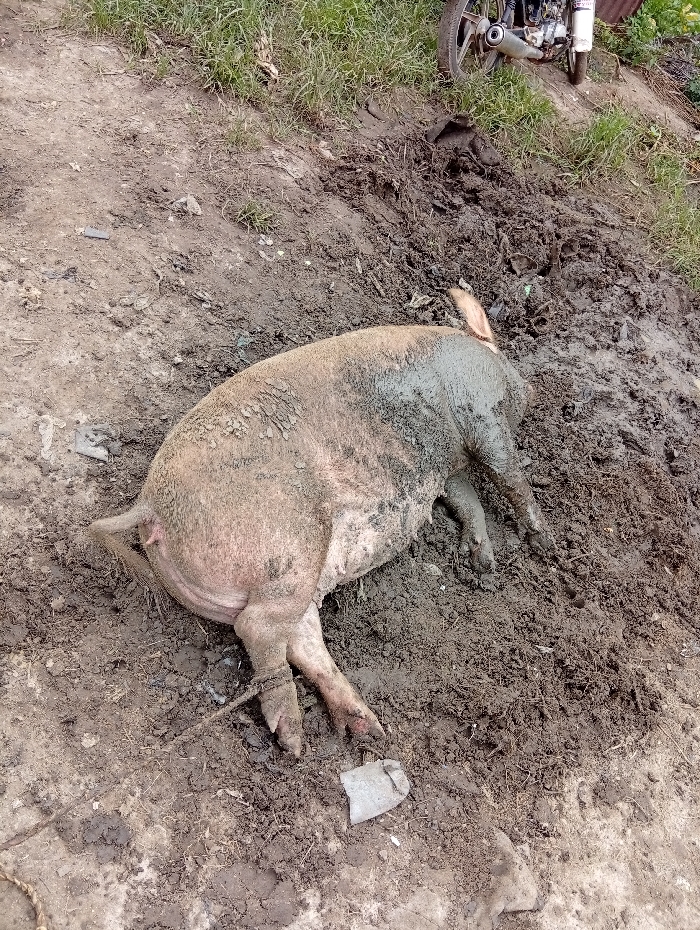 - "The image displays a large, light-skinned domestic pig, extensively covered in brownish-gray mud, lying on its left side on a muddy surface" by FM-c0DJ22, licensed under CC BY 4.0