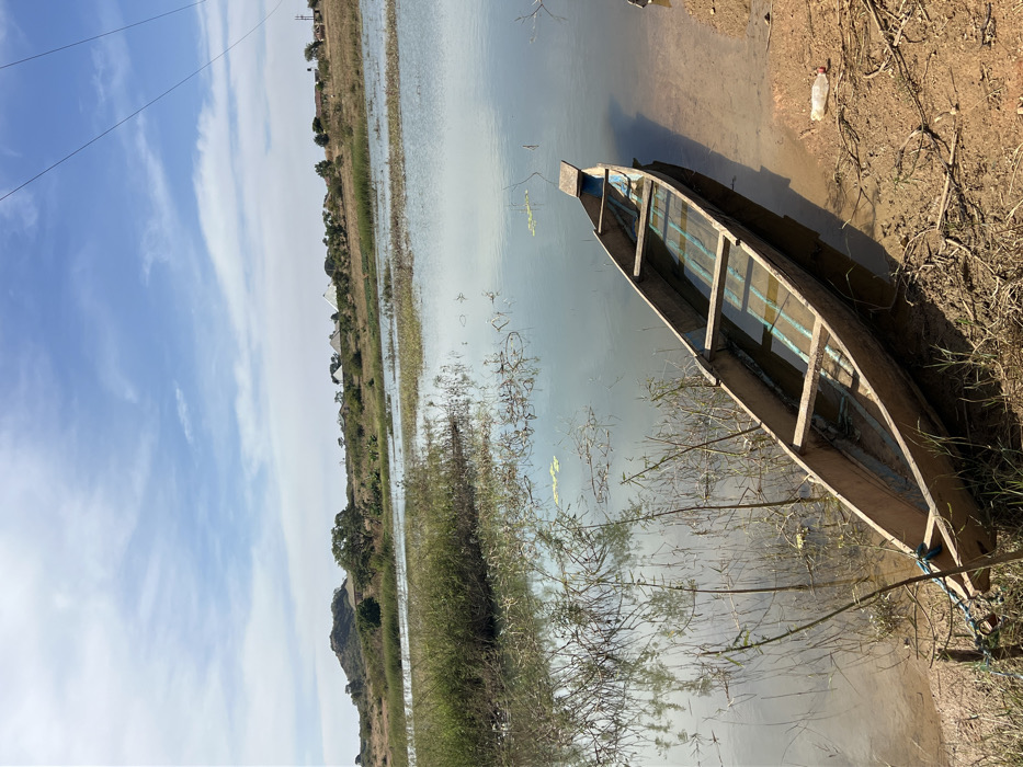 This image captures a scene in Jos, Nigeria, focusing on a body of water and its surrounding landscape. In the foreground, a weathered wooden dugout canoe is partially submerged in calm, greenish-tinted water, resting against a muddy, reddish-brown bank. A blue rope secures the bow of the canoe to a small stake or branch embedded in the bank on the left. Water is visible within the canoe's hull, reflecting the sky above. To the right of the canoe, a discarded clear plastic bottle lies horizontally on the dry earth of the bank. The water body is characterized by numerous emergent, leafless stalks and patches of green aquatic vegetation. Further into the midground, the water surface is broken by more dense, marshy vegetation. The background features an undulating terrain under a light blue sky with scattered white clouds. A distinct rocky hill is visible on the far left horizon. To the right, distant, dry hillsides are sparsely vegetated with trees and feature several small, scattered structures, some with light-colored, possibly conical roofs. Two dark power lines are visible stretching diagonally across the upper right quadrant of the sky.