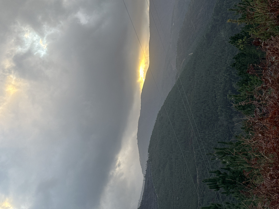 A landscape image depicts mountains silhouetted against a cloudy sky. A narrow break in the clouds allows sunlight to illuminate the horizon. Power lines extend across the scene. The right side of the image is dominated by dark green foliage. The overall tone is moody and atmospheric.