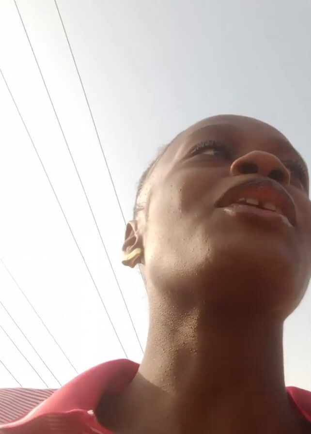 A person with dark skin and short dark hair wearing a red and white striped shirt is looking upwards at the sky. Power lines are visible overhead. The sun is very bright.