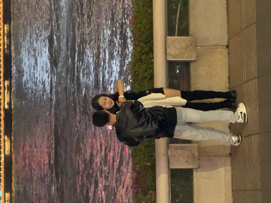 The image depicts a nighttime scene on a paved riverfront promenade in what appears to be Haizhu District, China. In the background, a large body of water, likely a river, reflects numerous red, blue, and white city lights from across the bank, indicating an urban environment. A low concrete or stone railing, topped with green foliage, separates the walkway from the water. The walkway features tactile paving on the right. Two individuals, an adult male and an adult female of East Asian ethnicity, are present on the promenade. The male stands with his back mostly to the viewer, wearing a black bomber jacket over a dark shirt, light blue jeans, and white sneakers with distinct black star motifs. He holds a smartphone vertically with both hands, aimed towards the female, suggesting he is taking a photograph or video. The female stands to the male's right, facing him with a slight turn towards the viewer. She wears a dark, possibly black, sleeveless dress with a short skirt and black, over-the-knee boots. A light-colored garment, appearing to be a jacket or shawl, is draped over her left arm. A white wristband is visible on her left wrist. Her right arm is raised with her hand near her left shoulder. She has a subtle smile on her face, appearing to pose for the male. The interaction suggests a personal connection, with the male documenting the female.