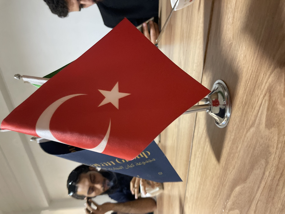 The scene, located in Al-Muhajerin Municipality, Syria, depicts an indoor environment, likely an office or meeting room, with a light-colored wooden table positioned against a plain white wall. In the foreground, a small red desk flag of Turkey, featuring a white crescent moon and star, is centrally placed on a silver metallic stand. Behind it, a dark blue flag with white Arabic text, partially legible as "مجموعة كيان للتجارة" (Kayan Group for Trade), is visible. A third flag, green and white, is minimally visible to the right of the Turkish flag. Two adult males are present at the table. On the left, a man with a beard and dark hair, wearing sunglasses pushed onto his head, holds a lit cigarette or cigar in his right hand, exhaling smoke. A clear glass mug containing light-colored contents is positioned in front of him. On the right, a second man with dark hair and a beard, wearing a dark jacket or shirt, is partially visible, looking downwards towards a small white bowl with a spoon. No direct interaction between the individuals is observed.