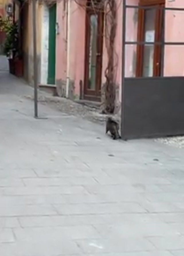 A tabby cat stands on a tiled street, then slowly walks away toward a stone archway. There are pink and other colored buildings on the right side of the screen. The sun is out. There are a few plants in pots on the left side of the screen.