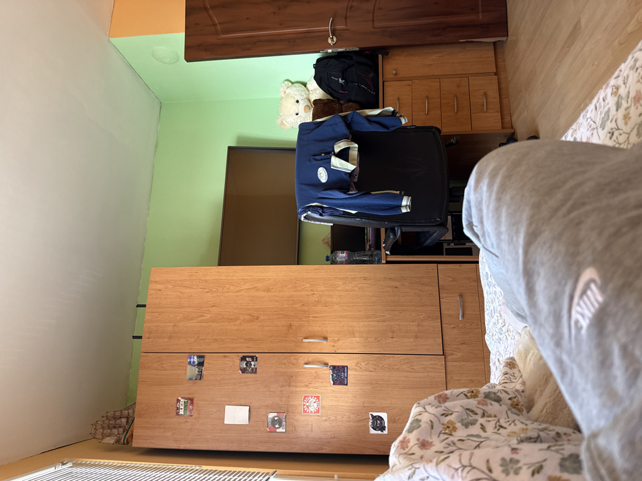 The image displays an indoor room in Pazardzhik, Bulgaria, viewed from a low perspective, likely from a bed. In the immediate foreground, the lower legs of an individual wearing grey sweatpants with a visible white Nike logo on the left leg are seen resting on a bed covered by a white duvet with a floral pattern of green, yellow, and orange. Adjacent to the legs is a light-colored, fluffy item. The room features light green walls, with a section of orange paint on the far right wall near a closed brown wooden door with a silver handle. On the left, a tall, light-brown wooden wardrobe with two doors and a bottom drawer stands. The left wardrobe door is adorned with multiple stickers and magnets. A model sailing ship is positioned on top of the wardrobe. A window with light-colored horizontal blinds is visible on the far left. Centrally, a dark flat-screen television is mounted on the light green wall. Below the television, a black office chair is positioned, draped with a dark blue long-sleeved shirt featuring white and yellow accents. To the left of the chair, on a desk surface, a plastic water bottle is present. To the right of the chair, a light-brown wooden chest of drawers holds a large, light-colored teddy bear and a black backpack. The ceiling is white.
