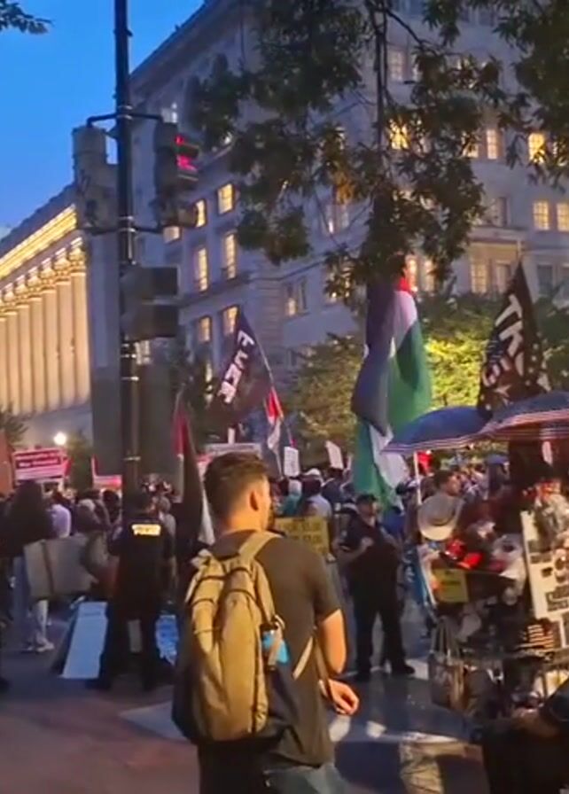 gathering of people on a city street at dusk, holding flags and signs. Several Palestinian flags are visible. There are buildings with lit windows in the background, and some trees lining the street. A group of police officers is present, monitoring the crowd. Some people are standing around talking, while others are walking. The overall atmosphere seems to be one of protest or demonstration.