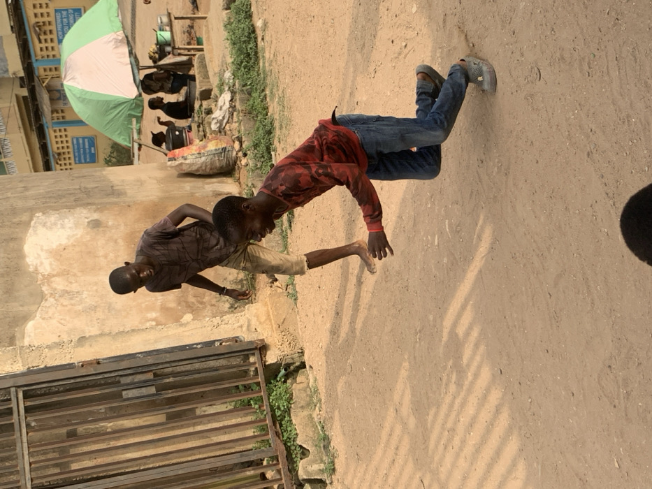 The scene is an unpaved outdoor area in Ijegun, Nigeria, illuminated by bright sunlight