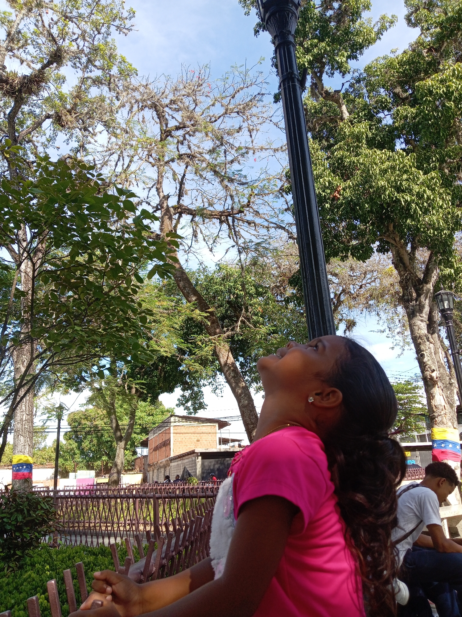 A low-angle exterior view depicts a public urban green space, likely a park or plaza, in Parroquia Ocumare, Venezuela. The central subject is a young girl, positioned in the lower-right quadrant, with dark skin and dark hair, wearing a bright pink short-sleeved top and a small light-colored stud earring. She is looking upwards and slightly to the right, with her mouth slightly open in a pleasant expression; her hands are clasped in front of her, resting on a surface. To her right, a black, fluted lamppost extends vertically. In the midground, a dark brown, picket-style fence separates the foreground from dense green shrubbery. Further back on the right, a young male with short dark hair, wearing a white t-shirt and dark pants, is seated on a light-colored bench, looking downwards. The upper portion of the image is dominated by a clear blue sky with scattered white clouds and a dense canopy of trees. The trees exhibit varied foliage, some with vibrant green leaves and others with sparser, lighter green leaves or branches covered in moss-like epiphytes. Overhead power lines are visible crossing the background. In the far background, beyond the trees and fence, urban structures are discernible, including a building with reddish-brown brick walls. Two cylindrical objects, potentially tree trunks or posts, wrapped in fabric displaying the yellow, blue, and red colors of the Venezuelan flag, are visible on the left and partially obscured on the right, providing national contextual markers.