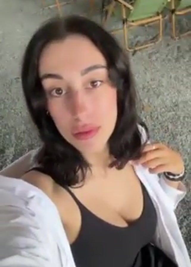 A woman films herself with a handheld camera. She has long, dark, wavy hair and dark eyes. She is wearing a black tank top and a white button-up shirt. She is wearing a silver bracelet on her left wrist and a smartwatch on her right wrist. The background shows a covered patio with plants, trees, string lights, and outdoor chairs. The camera moves slightly as she runs her fingers through her hair and adjusts the front of her shirt.