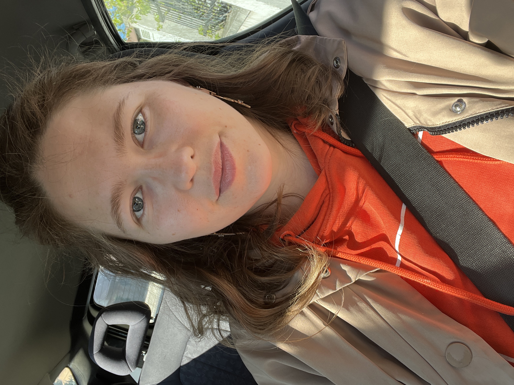 A woman is seated in a car, wearing a seatbelt. She has light skin, brown hair, and blue-gray eyes. She is wearing an orange hoodie and a beige jacket. The car's interior is visible, including the headrest of the seat behind her. The location is potentially Podgorica, Montenegro, but there is no definitive evidence in the image to confirm this.