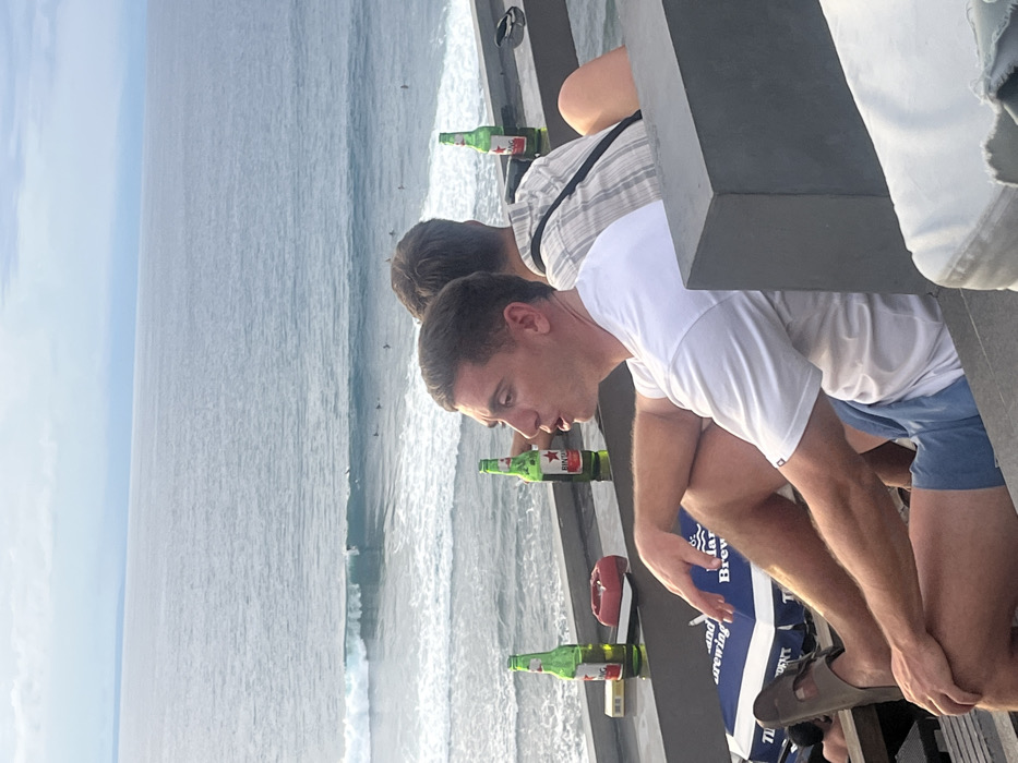 Two adult males are observed seated at an elevated dark grey barrier or table, overlooking the ocean in Uluwatu, Indonesia