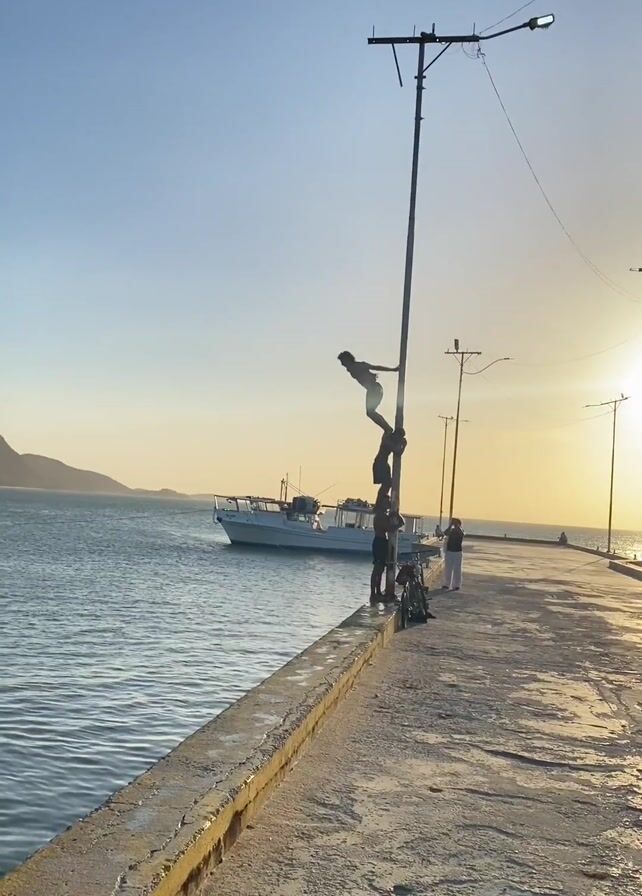 group of people on a concrete pier. A person climbs a metal pole. They jump from the pole into the water. The scene is outdoors on a sunny day. The water appears to be a bay, with a boat visible and land in the background. Other people are standing on the pier, one with a bicycle.