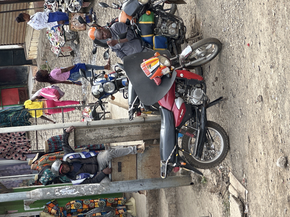 Several individuals stand and sit beside parked motorcycles on a dirt path. The motorcycles are red, black, and blue. A man in a gray shirt and orange cap sits on a motorcycle, looking at his phone. Another man in a helmet and blue vest leans against a concrete structure. A few women are standing near clothing displays. Buildings line the side of the path with various fabrics and goods displayed.