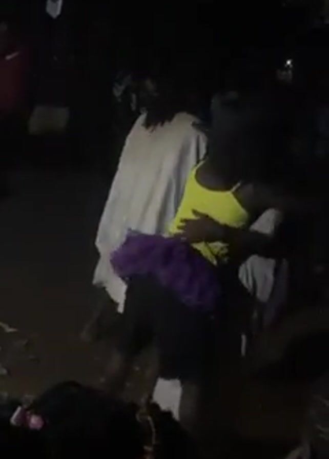 The video, captured at night in a dimly lit outdoor space, shows a group of people engaged in a lively activity. The central figures include a person wearing a white robe and another dressed in a yellow tank top and a purple tutu. They are closely interacting, with the individual in the robe seemingly lifting the person in the tutu. Other people are visible in the background, but their activities are less clear due to the low light. The environment appears to be a yard or open area with dirt ground.