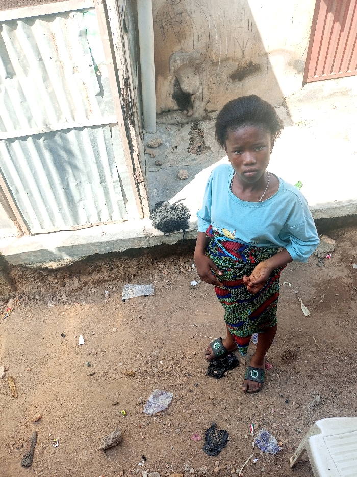 An image captured in Zango-ndaji, Nigeria, depicts a young female child standing on a dirt ground in what appears to be an outdoor, unpaved area