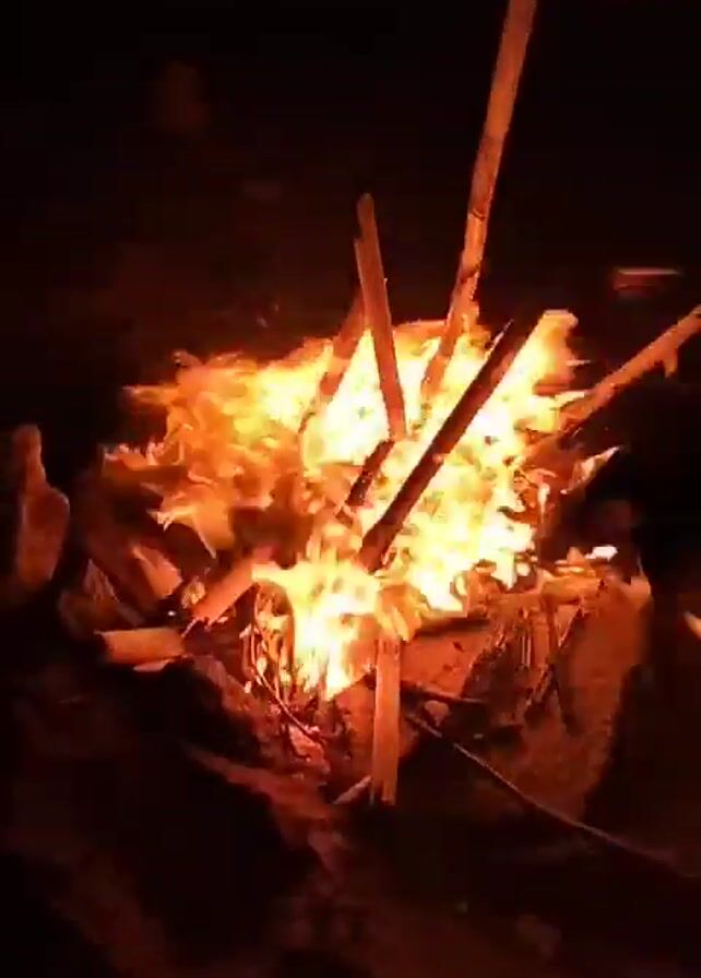 campfire burning in the dark. The fire is made of sticks and wood, and the flames are bright orange. The ground around the fire is dark and looks like dirt. A shadow is cast in the corner of the screen. The camera seems to be held by hand.