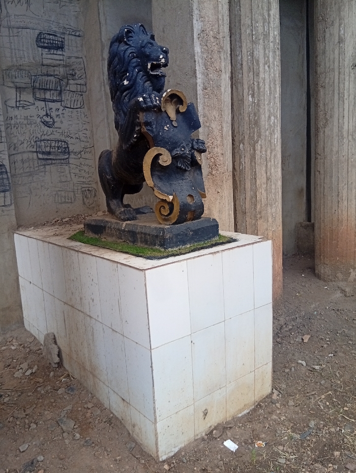 The scene depicts a weathered, dark-colored lion statue located outdoors at Itakpe Junction, Nigeria
