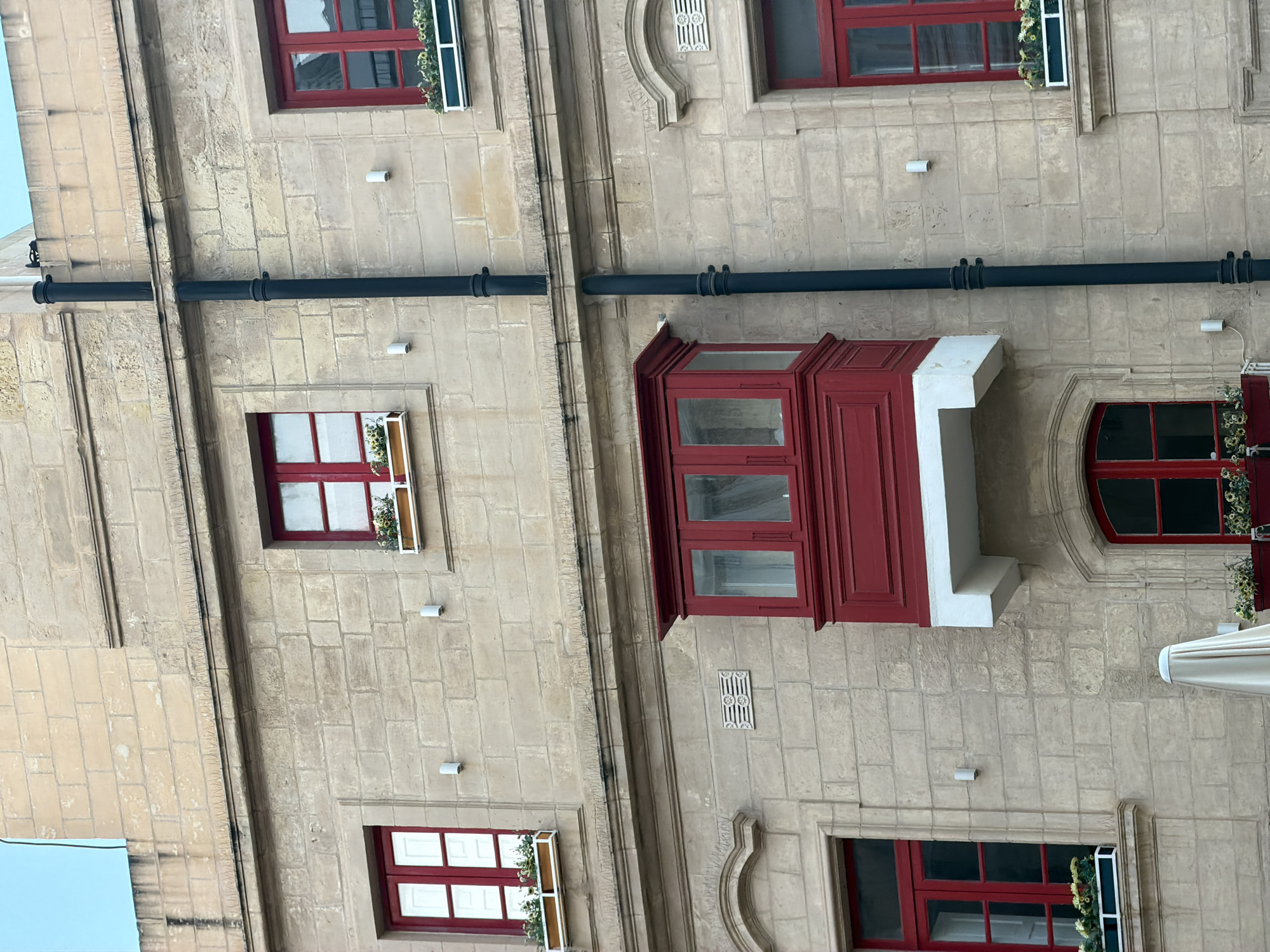 The image depicts a portion of a building in Valletta, Malta, characterized by light-colored stone walls. The facade features several windows, most of which are rectangular with red frames and white window boxes filled with greenery. A red oriel window with a white support extends from the wall on the right-hand side of the image. A black pipe runs horizontally across the facade. The overall aesthetic is historic and architectural.