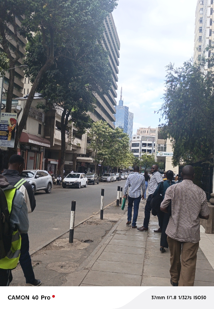 A bustling city street scene, featuring people walking along a sidewalk on a sunny day. Cars are parked along the side of the road. Buildings, including a skyscraper, line the street, framed by lush green trees. A sign for "RCM College" is visible on one of the buildings. The photo includes the camera information: "CAMON 40 Pro" and "37mm f/1.8 1/327s ISO50."