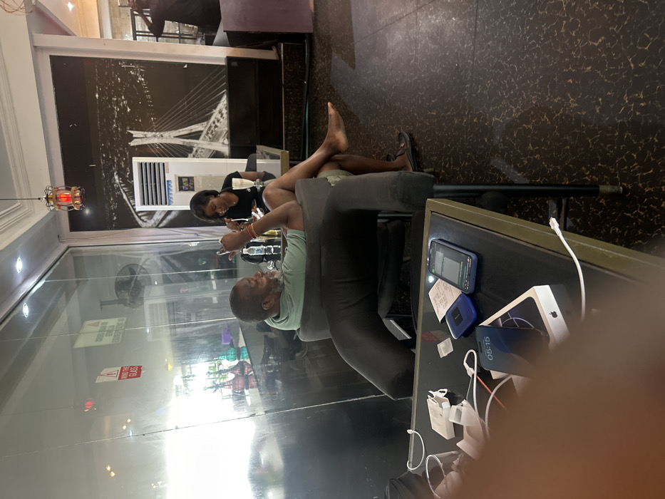 The scene depicts an interior view of a commercial establishment, likely a lounge or cafe, located in Ilado, Nigeria. In the mid-ground, a dark-skinned male subject, appearing middle-aged with a short beard, wears a light green polo shirt and dark shorts. He is seated in a dark grey upholstered armchair, leaning back with his right leg crossed over his left. His right foot is bare. He holds a smartphone in his right hand and gestures with his right index finger pointed upwards. His left arm rests on the armrest, and he displays a smile while looking towards the right side of the frame. On a small table next to him, a clear glass and a small bottle are visible. In the background, a dark-skinned female subject with long dark hair wears a dark short-sleeved top. She is seated at a dark table, observing a smartphone in her hands. A tall glass containing a light-colored beverage with a straw is on the table in front of her. Her legs are crossed, and she wears dark sandals. Behind her, against a wall, a large black and white mural of a suspension bridge at night is displayed, with an air conditioning unit positioned in front of it. A metal lantern-style light fixture hangs from the ceiling. A glass partition on the left features "MIND THE GLASS" warning decals, and reflections show multiple hookah pipes. In the foreground, on a dark rectangular table, various items are scattered. These include a clear glass with liquid, a white Apple iPhone box, a blue smartphone displaying "05:15," a dark smartphone displaying an application interface, a small blue rectangular electronic device, multiple white charging cables (one connected to the iPhone box), a white paper receipt, and several small white rectangular objects. A human finger partially obscures the lower left portion of this table. The floor is dark with a light speckled pattern. In the far background, a third individual, partially obscured, is visible.
