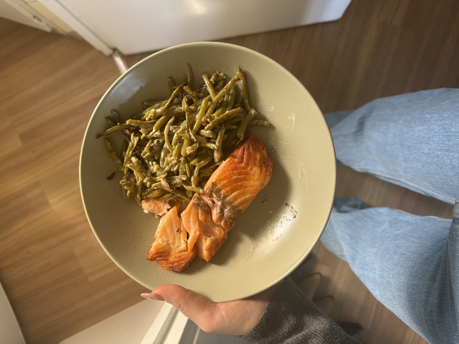 An overhead photograph captures a person holding a light olive-green ceramic plate containing a meal. On the left side of the plate are two cooked portions of salmon, displaying a prominent orange-pink color. To the right, a pile of green beans, coated in a light sauce or seasoning, is arranged. The person's left hand, featuring manicured nails with a light polish, supports the plate from below and to the left. A segment of a grey knitted garment is visible on the person's left forearm. Below the plate, the individual's upper legs are visible, dressed in light blue denim jeans. The immediate environment consists of a light brown wood-effect floor, and a portion of a white vertical structure, potentially a wall or appliance, is visible on the far right. The image contains no visual elements to determine its location as Paris, France.