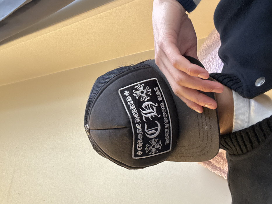 - "A close-up, eye-level indoor shot depicts an individual from the chest up, obscuring their face with a black trucker cap and their right hand" by FM-1CAfK2, licensed under CC BY 4.0