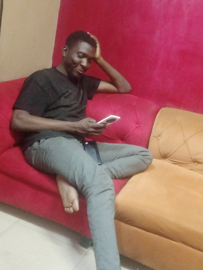 A man sits on a red and tan couch, glancing at his white smartphone. He wears a black t-shirt and gray pants, with one bare foot resting on the couch. One arm is bent, hand on his head, as he smiles at the phone screen. The background is a simple red wall.