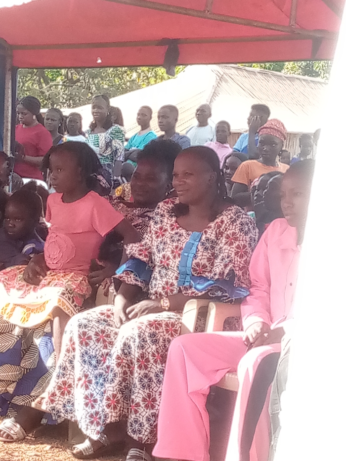 A group of people, mostly women and children, sit together, likely at an outdoor event. Some are seated on chairs, while others are in the background on bleachers. The women are dressed in colorful, patterned clothing, including pinks, blues, and reds. A red canopy is partially visible overhead. The lighting is bright, with some overexposure on the right side of the image.