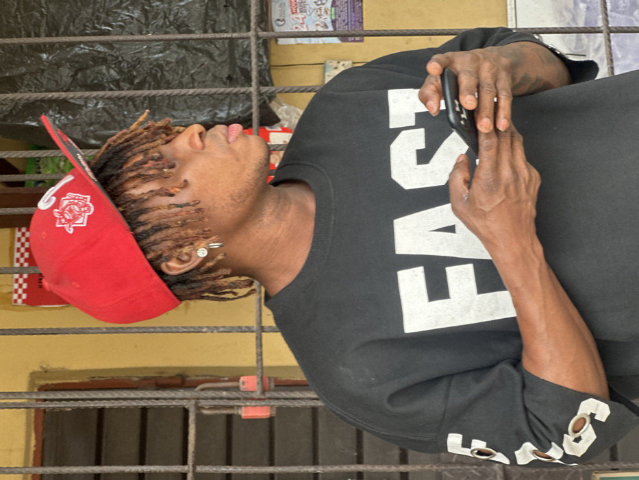 A male individual with medium skin tone and light brown dreadlocks is depicted in a medium shot in Langbasa, Nigeria