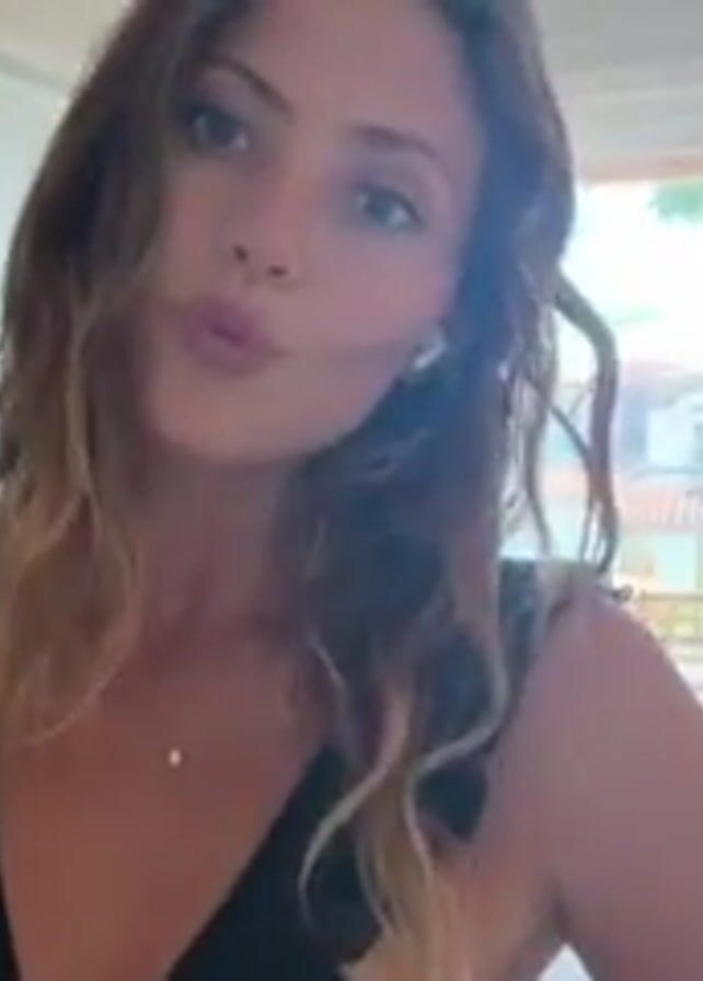 A woman with shoulder-length, wavy, brown hair, wearing a black, low-cut top with ruffles, is facing the camera and making a kissing face